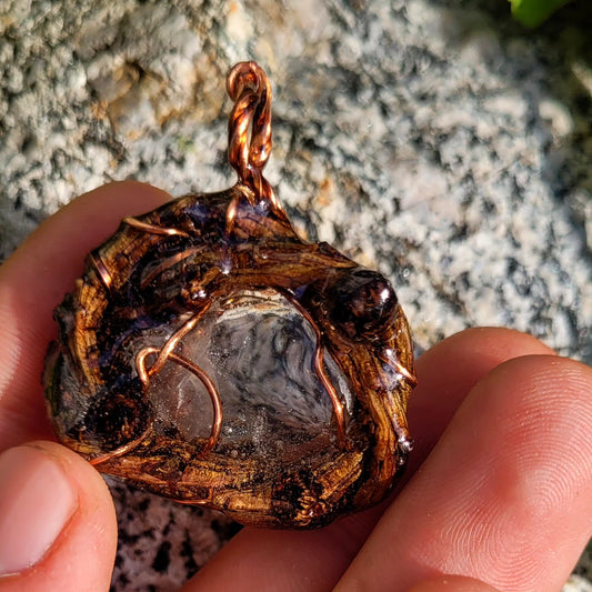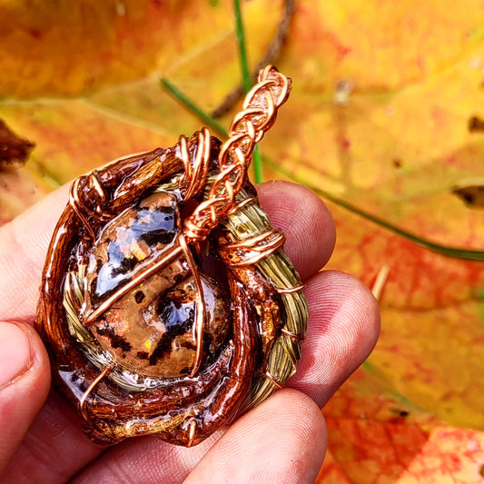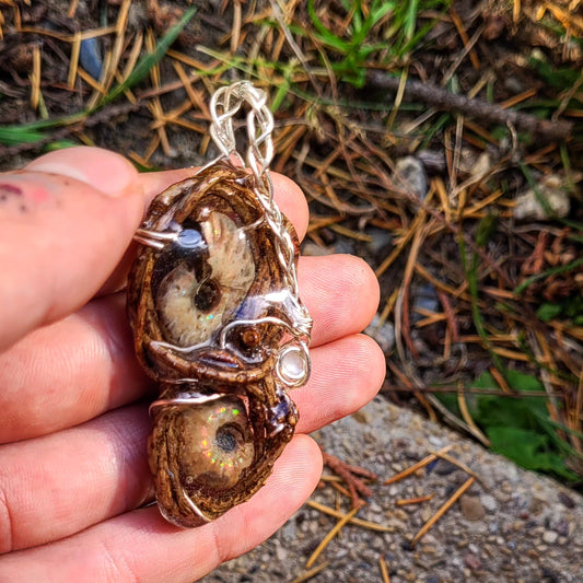 Double Sided Ammonite & Fire Opal Nested in Douglas Fir and Silver
