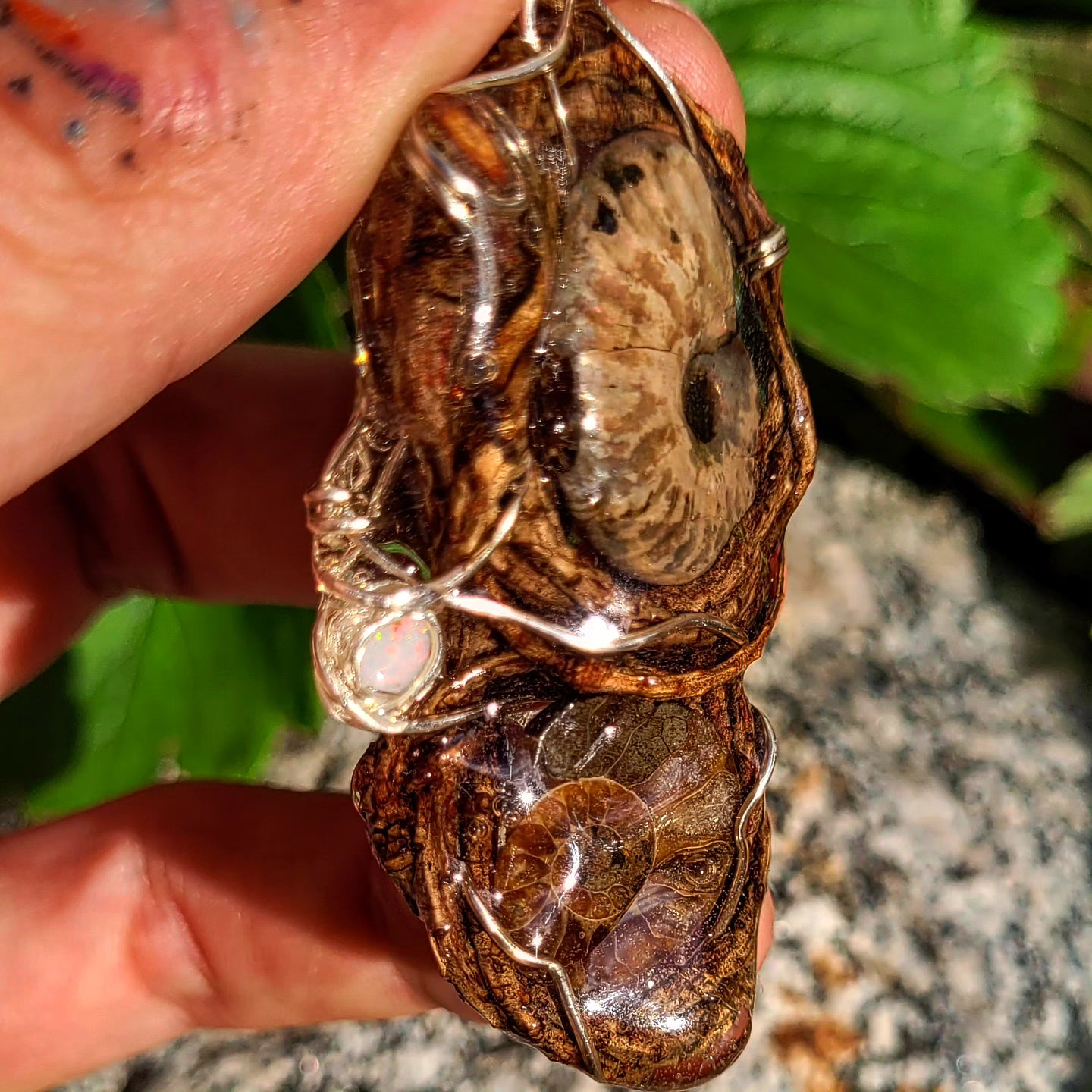 Adjustable cotton string included. A magical one of a kind spiritnest, Ammonite Fire opal nested in Douglas Fir, braided silver for the hanger of the pendant.