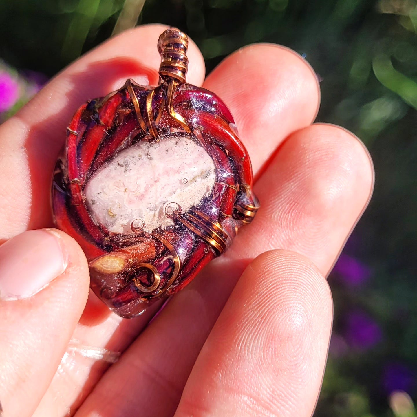 Adjustable cotton string included. A magical one of a kind spiritnest, Rhodochrosite wrapped in a bloodwood branch, copper for the hanger of the pendant.