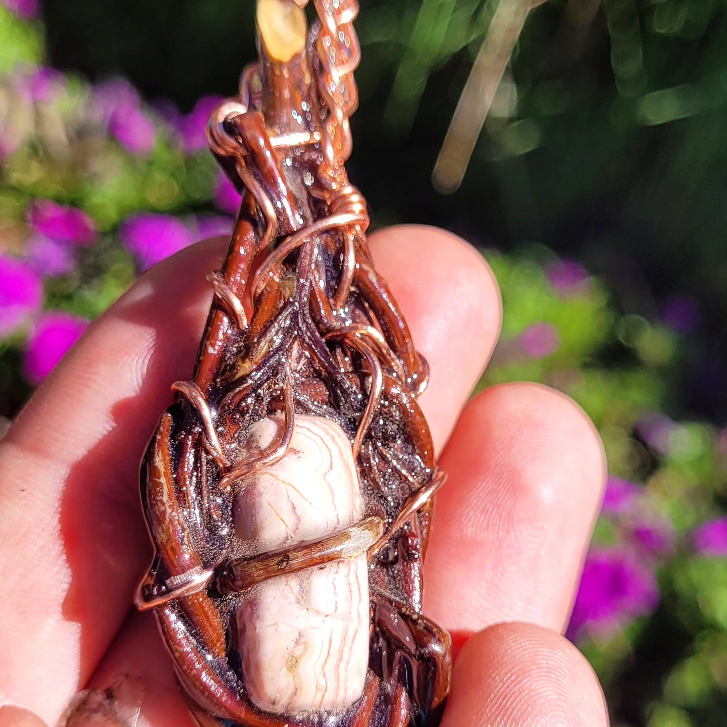 Adjustable cotton string included. A magical one of a kind spiritnest, Rhodochrosite wrapped in a bloodwood branch, copper for the hanger of the pendant.