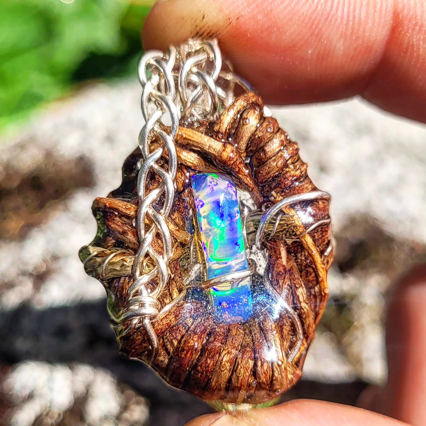 Adjustable cotton string included. A magical one of a kind spiritnest, Fire opal nested in Douglas Fir, braided silver for the hanger of the pendant.
