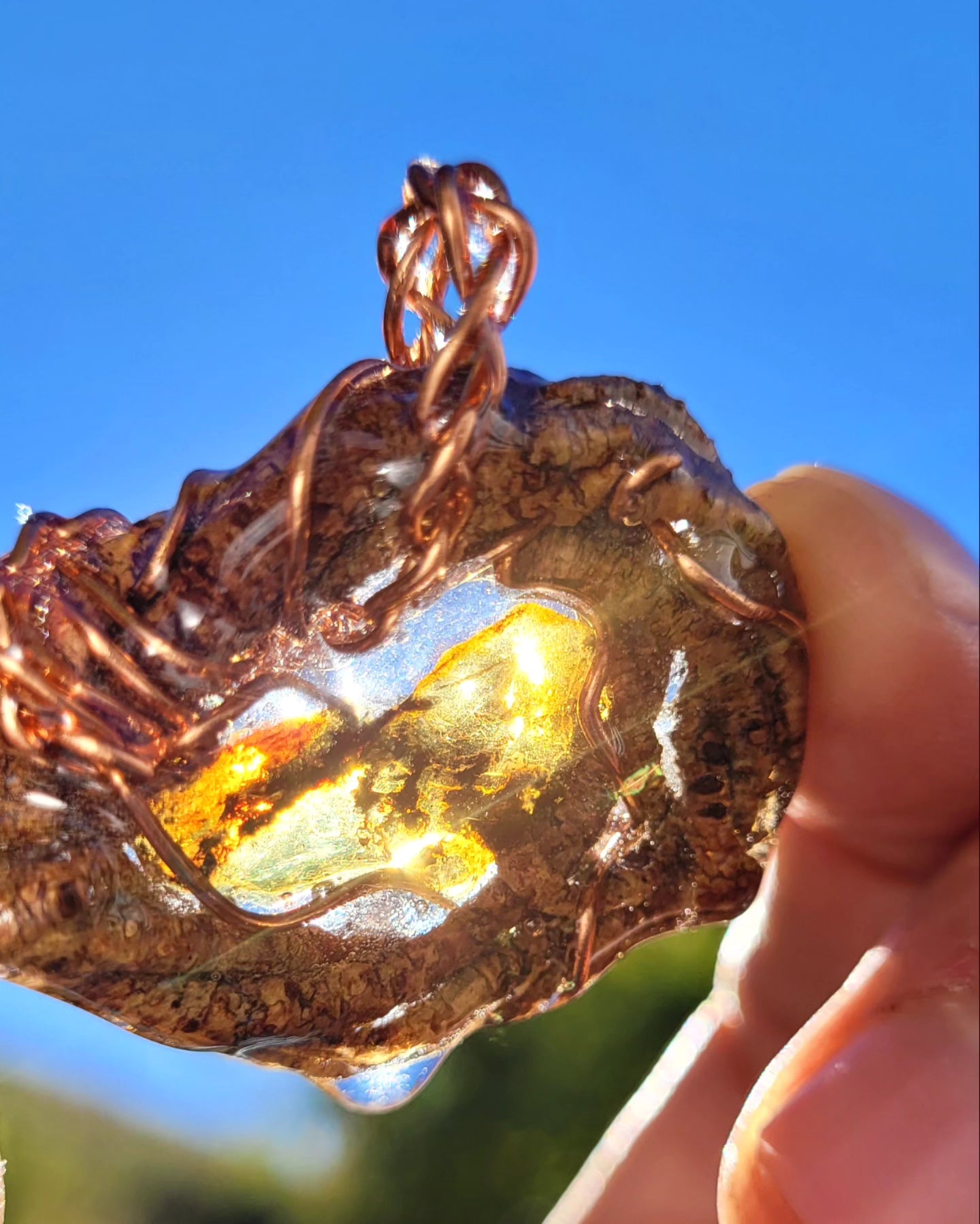 From the pine we receive soft healing energies, just as it's soft wood and nutrient rich pine needles support us physically. It's energetic properties are found much the same. Amber is thought to help absorb negative energy and to release bright, soothing energy, helping to calm nerves and enliven disposition like a mental sunny day. The different colors of amber are often used on the chakras with corresponding colors to facilitate opening and cleansing. Yellow amber has been used traditionally by natural healers to improve memory, increase mental flexibility and create balanced decision-making. Amber has also been used, historically, as a talisman for courage and self-confidence, and was thought to bring good luck to warriors in battle. The conductivity of the copper brings everything together, to be worn around your neck 💚🌱