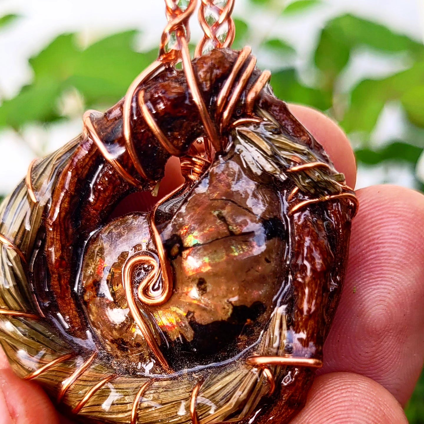 Double sided, Adjustable cotton string included. A magical one of a kind spiritnest, Ancient ammonite wrapped in a pine branch, braided copper for the hanger of the pendant.