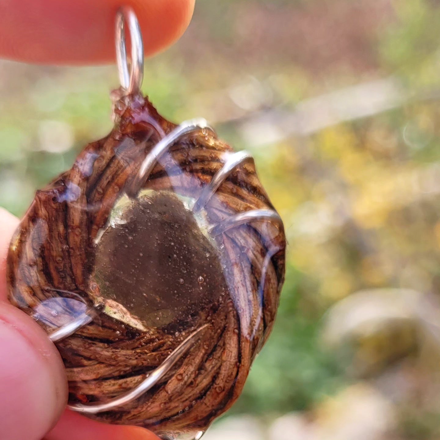 Double sided, Adjustable cotton string included. A magical one of a kind spiritnest, Tektite or Meteor Glass nested in DouglasFir, silver for the hanger of the pendant.