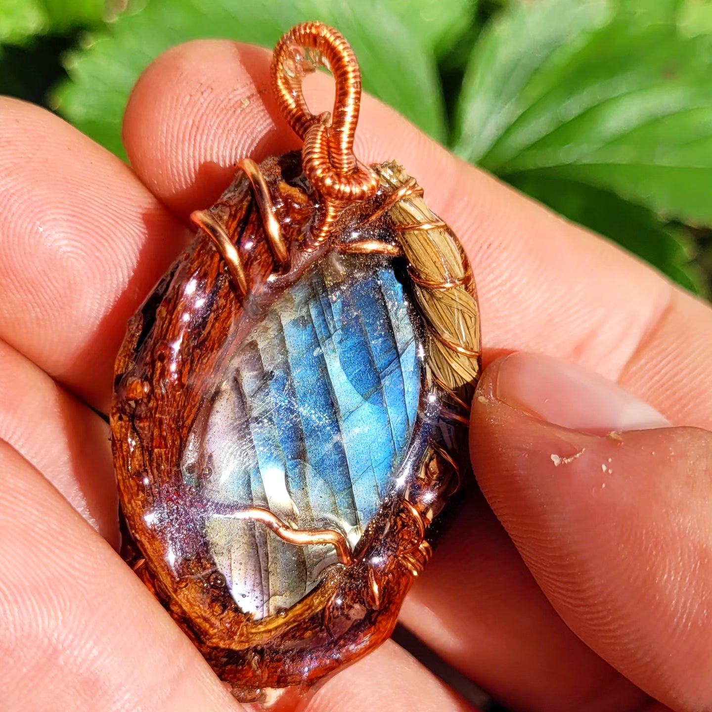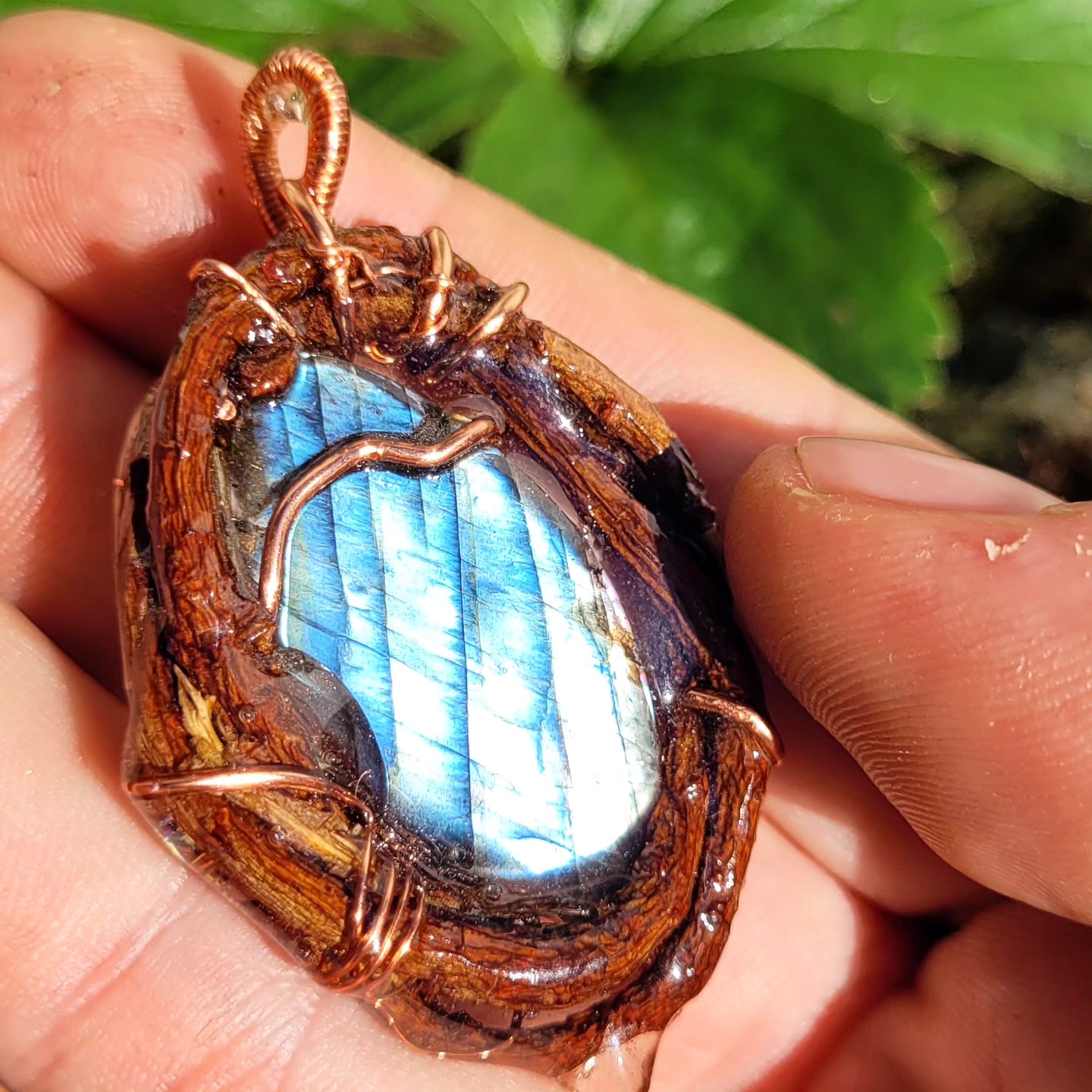 This is a nest of protection and empowerment. From the pine we receive soft healing energies, just as it's soft wood and nutrient rich pine needles support us physically. It's energetic properties are found much the same. Labradorite is a powerful stone of magic, offering us protection well aligning with the chakras that relate to the colors of light the stone holds. The conductivity of the copper brings everything together, to be worn around your neck 💚🌱