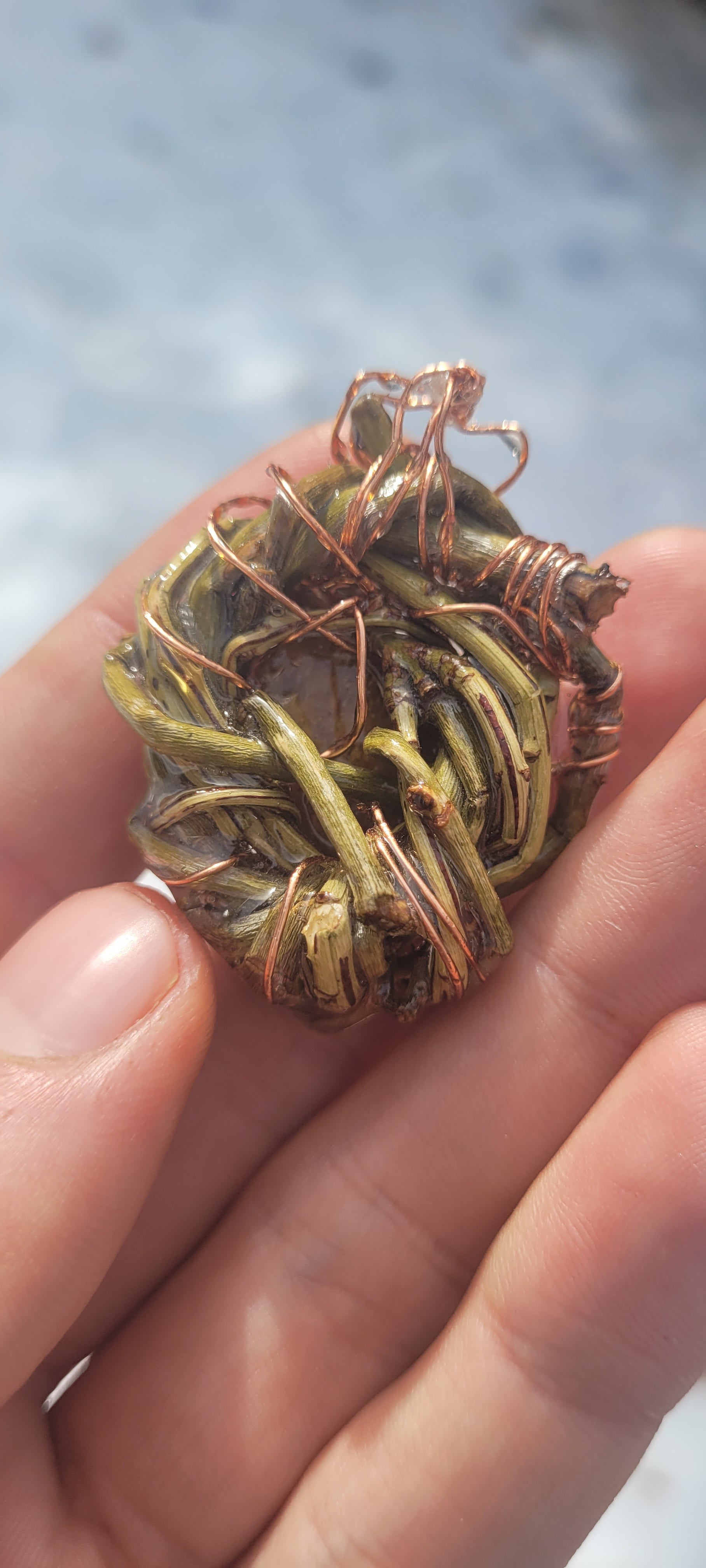I collect dying lower branches from trees after offering something in exchange. I begin steaming and weaving them together as a bird weaves a nest. Then take my time finding the earth spirit (stone or crystal) that wishes to rest in the nest. I wire wrap a sturdy way to hang them and once they're dry I dip them three times in a food safe, kitchen grade resin.